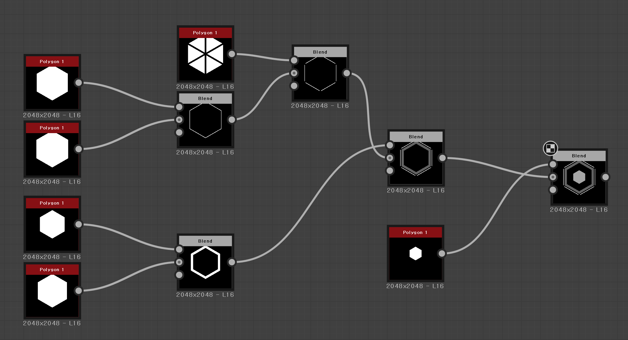 폴리건은 말 그대로 폴리건 각을 표현 한 노드이다. 각도 조정 및 스케일 조정, 또 추가로 그 각에 맞춰서 쪼갤수 있다.